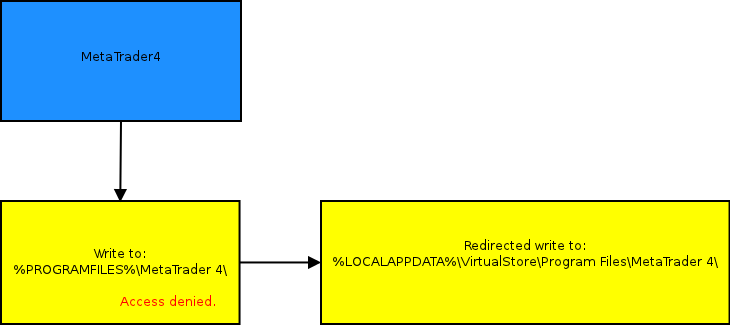 To let legacy application (like MetaTrader 4) work without being redesigned the concept of Virtual Store (sometimes called data redirection or data virtualization) was introduced that facilitates application compatibility.