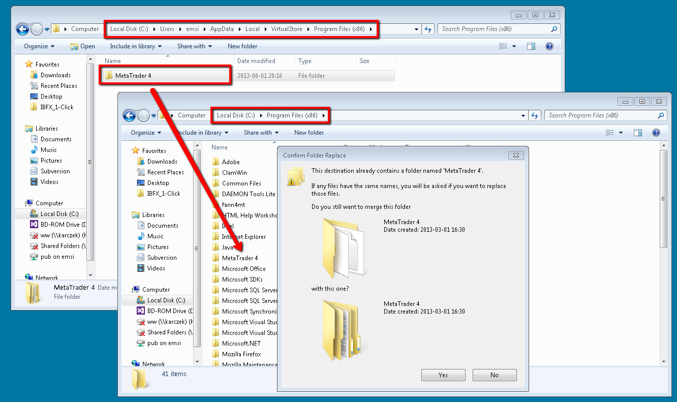 For the purpose of this article it is assumed that MetaTrader is installed in C:\Program Files\ (%PROGRAMFILES%) and Virtual Store resides in %LOCALAPPDATA%\VirtualStore\Program File\. If your system is 64bit version of windows those locations are C:\Program Files (x86)\ and %LOCALAPPDATA%\VirtualStore\Program Files (x86)\ respectively. Please keep in mind that actual path on your system might be different depending on the folder you installed your applications.